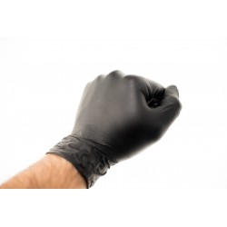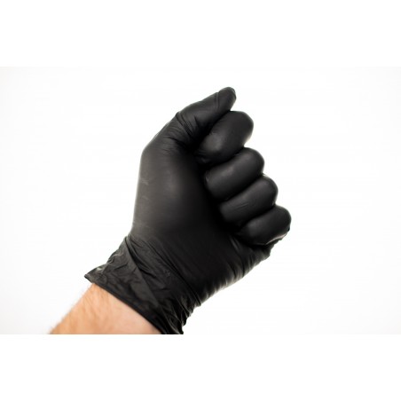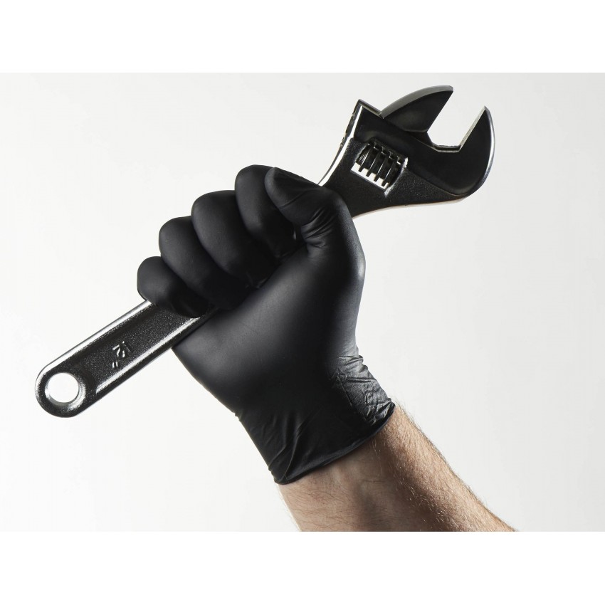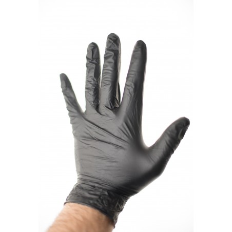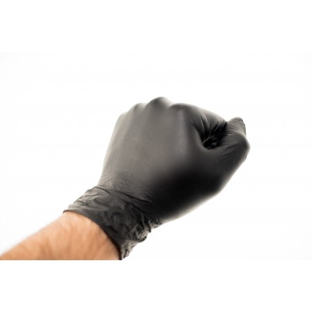 Guantes de nitrilo negro, no esterilizados y sin polvo, ambidiestros. Sin látex. Recomendado para Fuerzas y Cuerpos de Seguridad (policía, vigilantes, emergencias, etc.), centros de belleza y estética (pinturas, tatuajes, etc.), industria del automóvil (mecánica).
